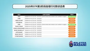 2025年第三阶段“现金援助计划”(STR)目前已成为众多政府援助受惠者关注的焦点。许多人想知道第三阶段STR的款项是否已经存入银行账户,或仍处于更新处理中。本文将列出各银行的最新状态,并提供简单的查询指南。 2025年STR第三阶段付款日期 根据马来西亚财政部的正式公告,第三阶段STR的发放将于2025年8月12日开始,并将根据不同银行类型及受惠类别分批入账。 重要提示:款项入账过程可能需要1至3个工作日,视收款银行的处理时间而定。 各银行STR第三阶段状态 以下为根据用户反馈及媒体报道整理的STR第三阶段最新入账状态: 最新更新:此状态截至2025年8月12日早上8:00,后续可能因银行处理进度而变化。 如何查询STR是否已入账 1. 网上银行 / 手机银行 2. 自动提款机(ATM) 3. STR官方网站 受惠者重要提示…